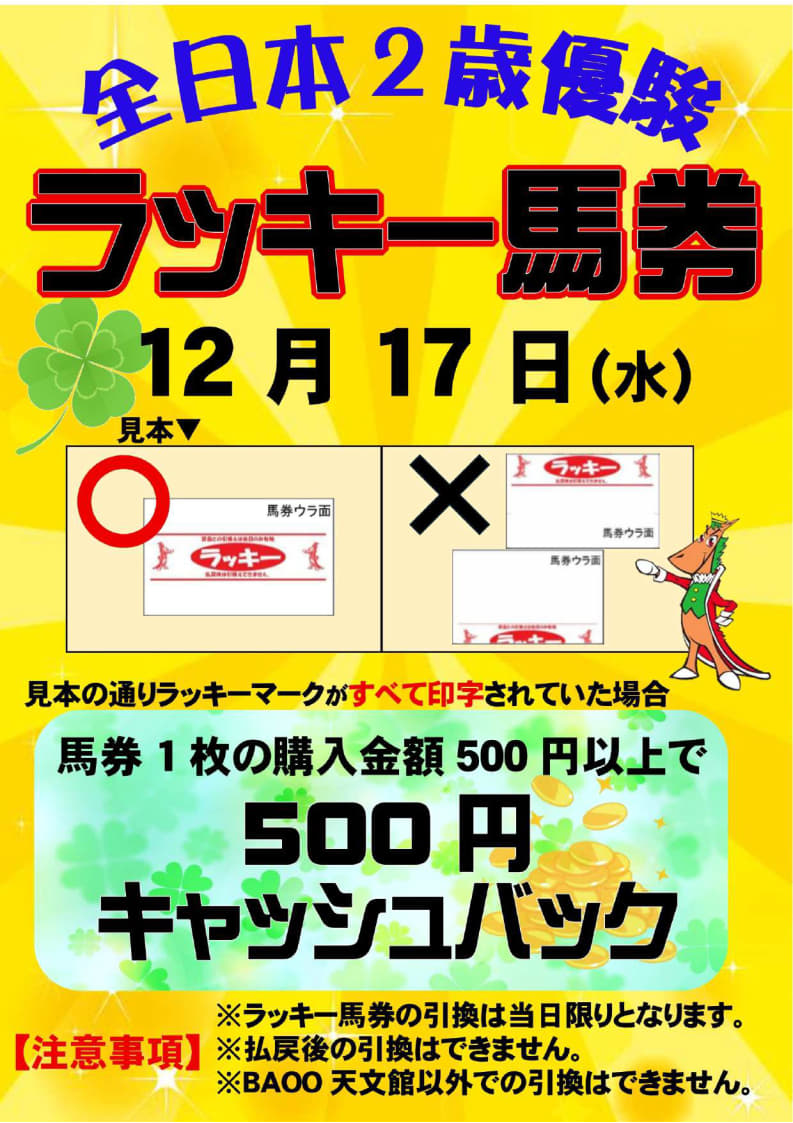 BAOO天文館では、全日本2歳優駿開催日(12月17日)にイベントを実施します。