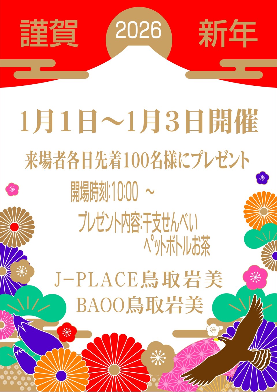 BAOO鳥取岩美では、1月1日(祝木)~3日(土)に各日先着100名様に干支せんべいとお茶をプレゼントします。
