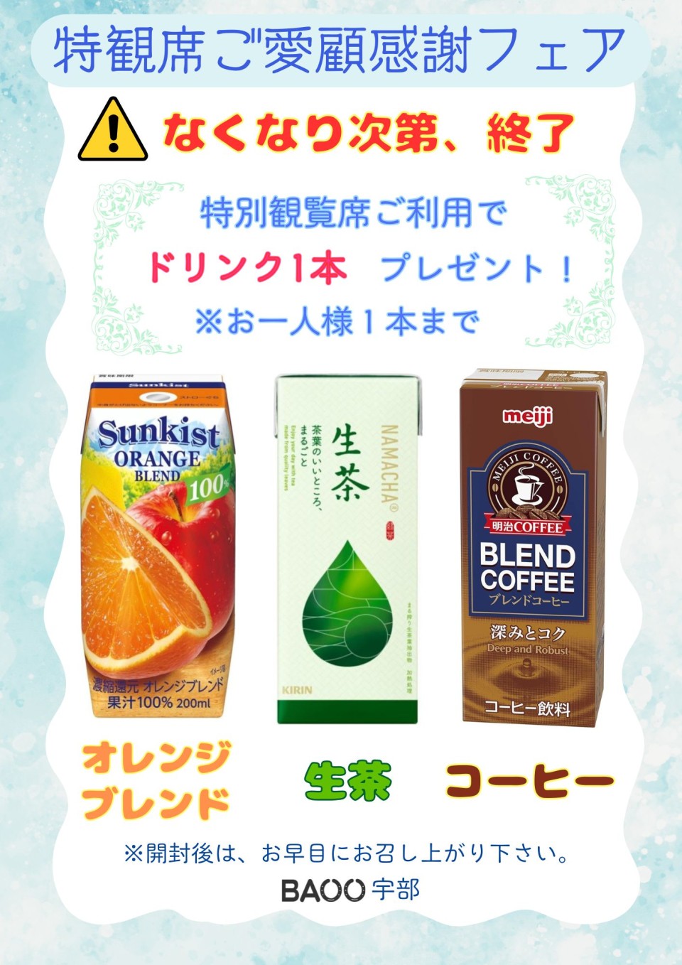BAOO宇部では、1月14日より特別観覧席でのドリンクサービスを実施します。